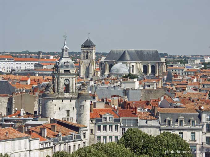 La Rochelle, terrasse de la tour Saint-Nicolas, vue sur la Grosse Horloge et la cathédrale